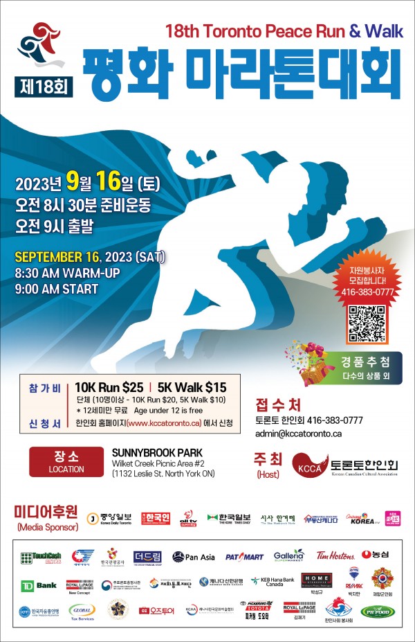 제 18회 평화마라톤 작성자 정보 관리자 작성 작성일 2023.08.29 15:11 컨텐츠 정보 781 조회 목록 본문 토론토 한인회에서는 한캐 수교 60주년을 기념하고자 2023년 9월 16일(토)에 제18회 평화마라톤을 개최합니다. 관련자료 링크 https://www.kccatoronto.ca/ 187 회 연결 이전 [보도] Good Neighbors, Step4 Water 작성일 2023.09.01 14:26 다음 [보도] 소외된 목소리에 주목하며 양국의 미래가치 추구한다 작성일 2023.08.23 15:14 댓글 0 등록된 댓글이 없습니다. 로그인한 회원만 댓글 등록이 가능합니다. 목록