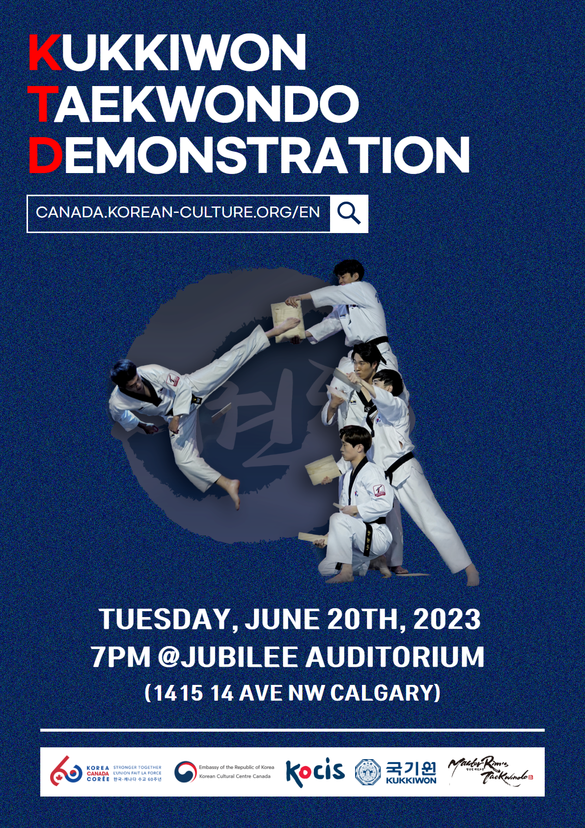 해외문화홍보원(KOCIS, 원장 김장호)과 주캐나다 한국문화원(KCC, 원장 이성은)은 6월 20일 화요일 저녁 19시 (MT), 캐나다 앨버타주 캘거리 서던 앨버타 주빌리 공연장 (Southern Alberta Jubilee Auditorium)에서 국기원 태권도 시범단 공연을 펼친다.