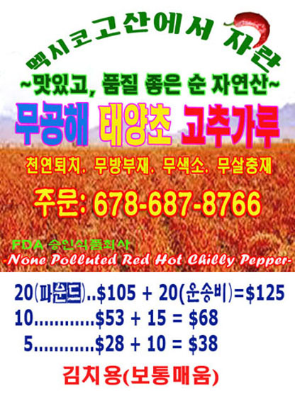 12월에 수확한 멕시코 고산 무공해 태양초 고추가루! 작성자 정보 riverflow 작성 작성일 2025.04.13 07:47 컨텐츠 정보 2,513 조회 목록 본문 12월에 수확한 멕시코 고산 무공해 태양초 고추가루! 관련자료 이전 새끼 진돗개 파실 분 연락 부탁드립니다. 작성일 2025.04.15 13:44 다음 압박 스타킹 작성일 2025.04.12 10:25 댓글 0 등록된 댓글이 없습니다. 로그인한 회원만 댓글 등록이 가능합니다. 목록
