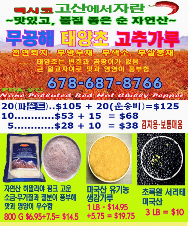 신선한 고추향과 맛 무공해 태양초 고추가루! 작성자 정보 riverflow 작성 작성일 2025.09.28 06:36 컨텐츠 정보 957 조회 목록 본문 신선한 고추향과 맛 무공해 태양초 고추가루! 관련자료 이전 비싼 나무 인당 한그루씩 드립니다. Woodbridge 지역. 좋은 나무 작성일 2025.09.30 13:31 다음 Imbera 영업용 원도어 유리쿨러(25x23x55`) $885. QBD 작성일 2025.09.26 13:33 댓글 0 등록된 댓글이 없습니다. 로그인한 회원만 댓글 등록이 가능합니다. 목록