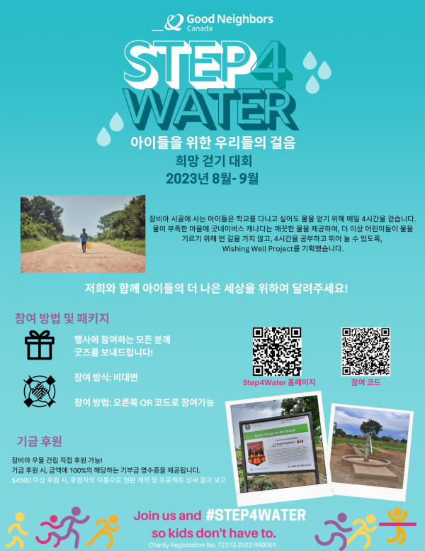 [보도] Good Neighbors, Step4 Water 작성자 정보 관리자 작성 작성일 2023.09.01 14:26 컨텐츠 정보 643 조회 목록 본문 아이들을 위한 우리들의 걸음 희망 걷기 대회 2023년 8월~9월 관련자료 링크 https://www.events.runningroom.com/site/18017/step4water-2023-virtual/ 205 회 연결 https://www.youtube.com/watch?v=N5E0-9Q38eg 172 회 연결 이전 [보도] 음악으로 나누는 희망: 100인과 함께하는 굿네이버스 자선 콘서트 작성일 2023.11.27 12:54 다음 제 18회 평화마라톤 작성일 2023.08.29 15:11 댓글 0 등록된 댓글이 없습니다. 로그인한 회원만 댓글 등록이 가능합니다. 목록