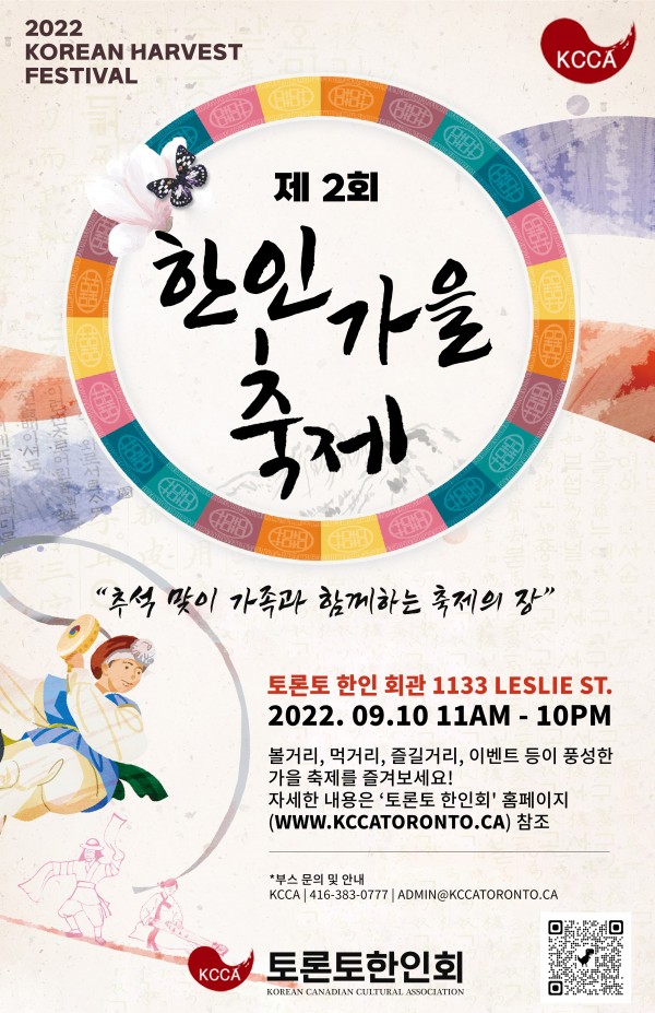 토론토 한인회(회장 김정희)에서는 축제의 계절, 가을을 맞이하여 “ 2022 제 2 회 한인 가을 축제” 를 개최합니다. 이번 가을 축제는 한국의 명절 ‘추석’을 맞아 전 세대가 함께 어우러져, 온 가족이 함께 즐길 수 있는 축제의 장으로 마련하였습니다.