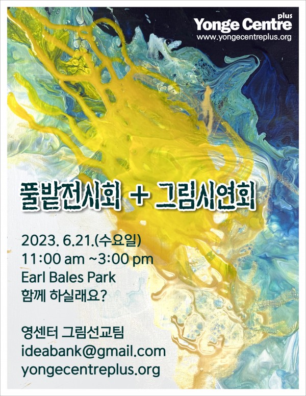 [보도] 6월 21일 풀밭전시회, 그림시연회 행사 진행 작성자 정보 관리자 작성 작성일 2023.06.19 12:26 컨텐츠 정보 831 조회 목록 본문 영 센터 플러스(토론토 영락교회 지역 선교센터)에서 6월 21일(수)에 풀밭그림전시회를 진행한다. 행사는 Earl Bales Park(4169 Bathurst St, North York)에서 열리며 오전 11시부터 오후 3시까지 진행된다. 그림시연과 아트풍선 만들기, 방문자 그려보는 행사도 같이 진행될 예정이다. 관련자료 링크 http://www.yongecentreplus.org/ 247 회 연결 이전 [보도] 주캐나다한국문화원, 캐나다 재즈 페스티벌 순회공연으로 한-캐 문화교류 활성화 도모 작성일 2023.06.23 15:22 다음 [보도] 캘거리에서 선보이는 화려한 태권도 공연, 숨막히는 기술의 아름다움 작성일 2023.06.05 15:40 댓글 0 등록된 댓글이 없습니다. 로그인한 회원만 댓글 등록이 가능합니다. 목록